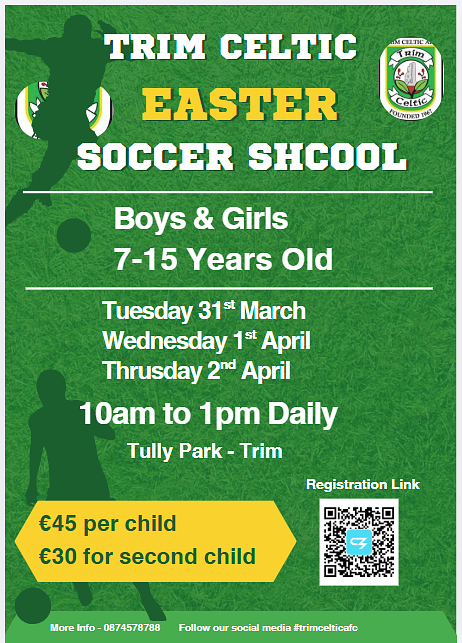 Looking for something fun for the kids this Easter? Join us at Trim Celtic AFC’s Easter Soccer School in Tully Park, Trim!